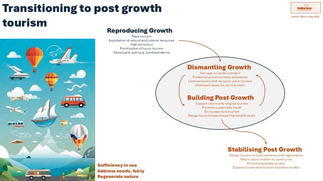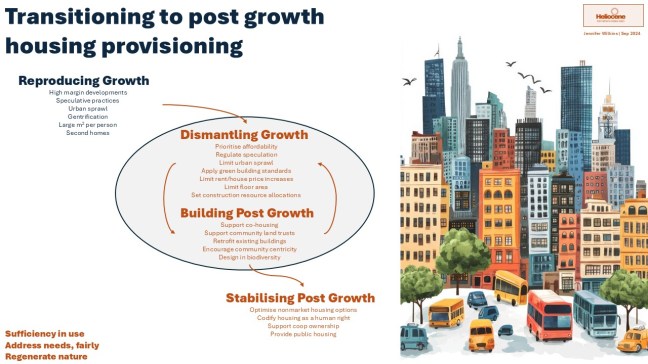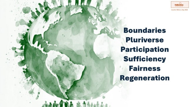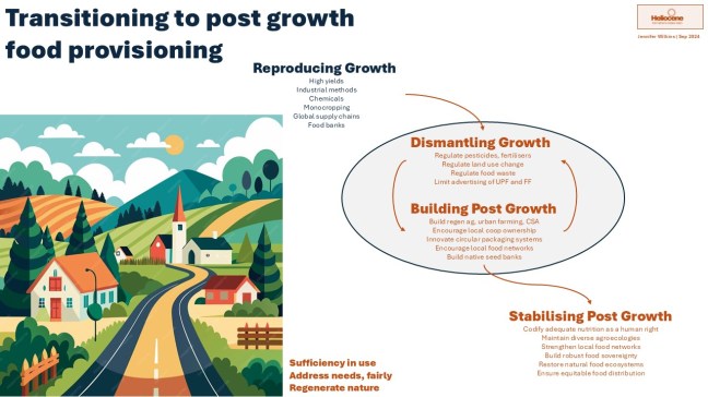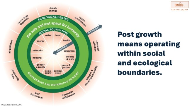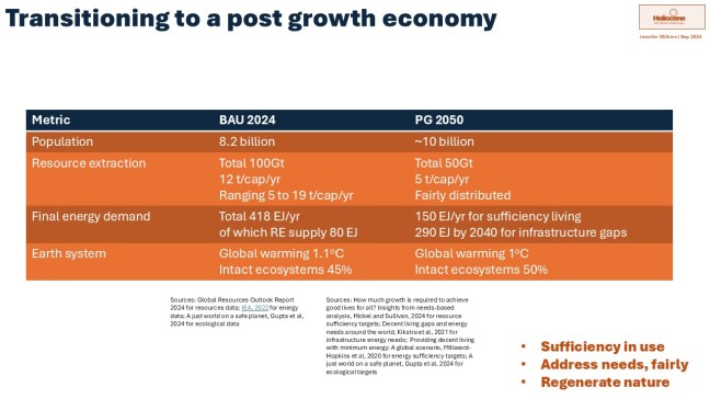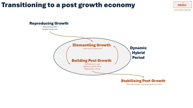 Hi, my name is Jennifer Wilkins. I research, advise and advocate for post growth business transformations. My practice goes under the name of Heliocene. I’m going to discuss the global macroeconomic backdrop to post growth transitions, the change that’s required in rich nations, and how industries such as food, housing and tourism might experience that change.