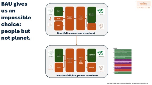 BAU gives us an impossible choice. Eradicate the poverty shortfall, but irreversibly transgress environmental boundaries. Considering this dilemma, it is unconscionable to choose to grow BAU to enrich the already rich, as all OECD governments are striving to do. The 10-year risk profile shows that we already expect this to happen. It is well understood that BAU is destructive and that systemic risks will affect all businesses, physically and reputationally. We would not choose to do this, so we must believe it is inevitable. Is it inevitable? Or is there another way?