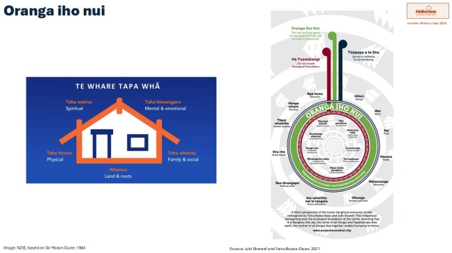 For instance, Māori have described their view of a good life on a safe planet using several models. The example on the left, very familiar to New Zealanders, is Te Whare Tapa Whā, the wellbeing meeting house, designed by Sir Mason Durie in the 1980s. Compared to Doughnut Economics, this model adds relationality or roots to the environmental, and it adds spiritual and emotional dimensions beyond the social. The example on the right is the Māori perspective on Doughnut Economics, depicted as Te Takarangi, the spiral of creation, in which the land is the foundation and social wellbeing springs up from the land.