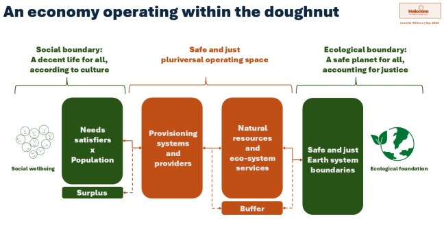 Going back to Doughnut Economics basics, a sustainable economy operates within a safe and just pluriversal operating space. It enables a decent life for all, according to culture. And a safe planet for all, accounting for justice.