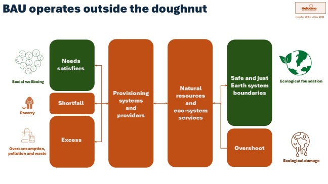 Our current global economy or business-as-usual (BAU), taken as a whole, operates beyond the walls of the doughnut. We are operating in shortfall – our provisioning systems are not distributing essential goods to where they are needed. We are also operating in excess – our provisioning systems are producing things far beyond what is needed for a good life. And we are operating in overshoot – our operating systems are extracting and polluting to an extent that the planet is becoming unsafe for people, particularly the vulnerable and the blameless.