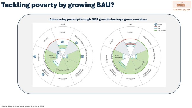 A paper published two weeks ago by a large group of climate scientists and economic modellers found that if BAU is grown enough by 2050 to tackle global poverty, we will irreversibly overshoot our climate boundary and reduce other safe corridors. We would, once and for all, lose the Holocene conditions in which humanity has thrived.