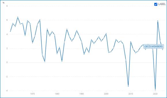 Figure 3: GDP growth (annual %) OECD members, 1960 to 2023 (World Bank)