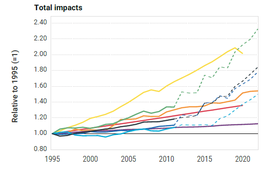 Figure 6: Population, GDP and environmental indicators, 1995 to 2022 (UNEP International Resource Panel)