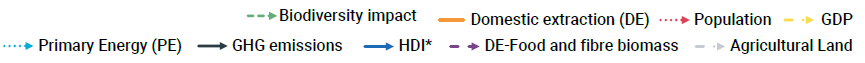 In contrast, a sustainability transition pathway (see figure 8) would increase GDP by 158% and human development by 53% and lower emissions by 83%—with extraction just 17% higher, biomass extraction 31% higher and primary energy use 27% lower.