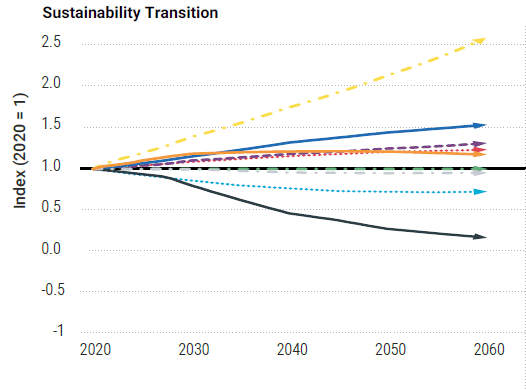 Figure 8: Projected UNEP Sustainability Transition scenario, 2020 to 2060 (UNEP International Resource Panel)