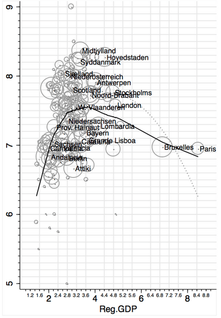 Figure 4: Average life satisfaction and aggregate incomes in EU regions, using data from 1994 to 2008 (Proto and Rustichini, 2013)