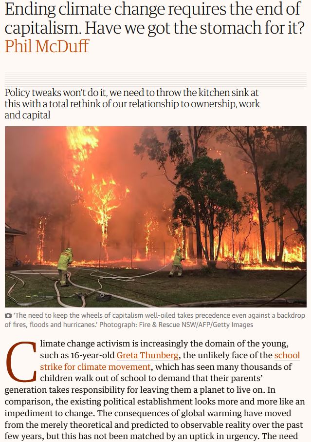 Mar 2019 – Phil McDuff: “Ending climate change requires the end of capitalism.” A radical position at the time—but one that captured the systemic scale of the crisis.
