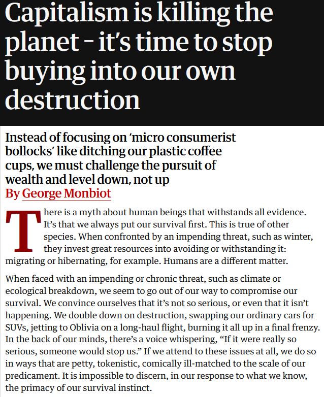 Mar 2019 – George Monbiot observed we weren’t correcting course, but doubling down on destruction—SUVs, long-haul flights and token fixes masking deep structural inertia.