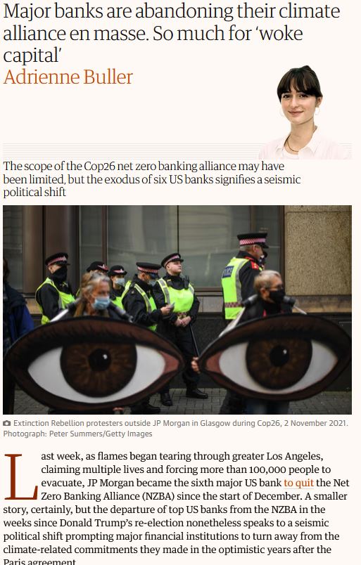Mar 2019 – Adrienne Buller reported six major US banks—including JP Morgan—had exited the Net Zero Banking Alliance amid climate-fuelled fires in LA and political headwinds. Commitments made in optimism, abandoned in volatility.