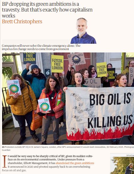 Mar 2019 – BP ditched its climate strategy under shareholder pressure. As Brett Christophers wrote: “This isn’t an exception. It’s how capitalism works.”