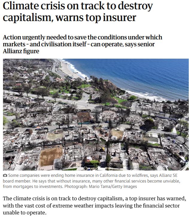 Mar 2019 – Günther Thallinger at Allianz, one of the world’s largest insurers, warned the climate crisis is on track to destroy capitalism itself, as entire sectors become uninsurable.